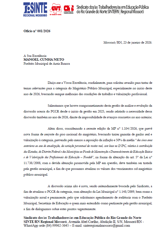 O Sindicato dos Trabalhadores em Educação Pública do Rio Grande do Norte (SINTE/RN Regional Mossoró) formalizou, nesta sexta-feira (23), o Ofício nº 001/2026 junto ao gabinete do prefeito de Areia Branca, Manoel Cunha Neto. O documento, protocolado pelo diretor da Regional e professor da rede municipal Fábio Júnior, reivindica a abertura imediata de uma mesa de negociações para tratar do reajuste salarial da categoria e da defasagem do Plano de Cargos, Carreira e Remuneração (PCCR).